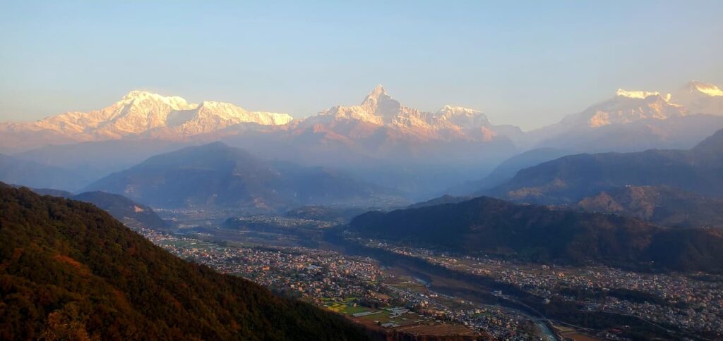 I watched the sunrise from Sarangkot, where I got a glimpse of local village life – people making warm clothes and shawls on traditional weaving machines and kids running around small huts. As I walked up to the top of the hill, I was met with a 180-degree view of the Annapurna mountain range, with the city of Pokhara just waking up in the valley below. Seeing the first ray of red sunlight reflecting over Annapurna was amazing.